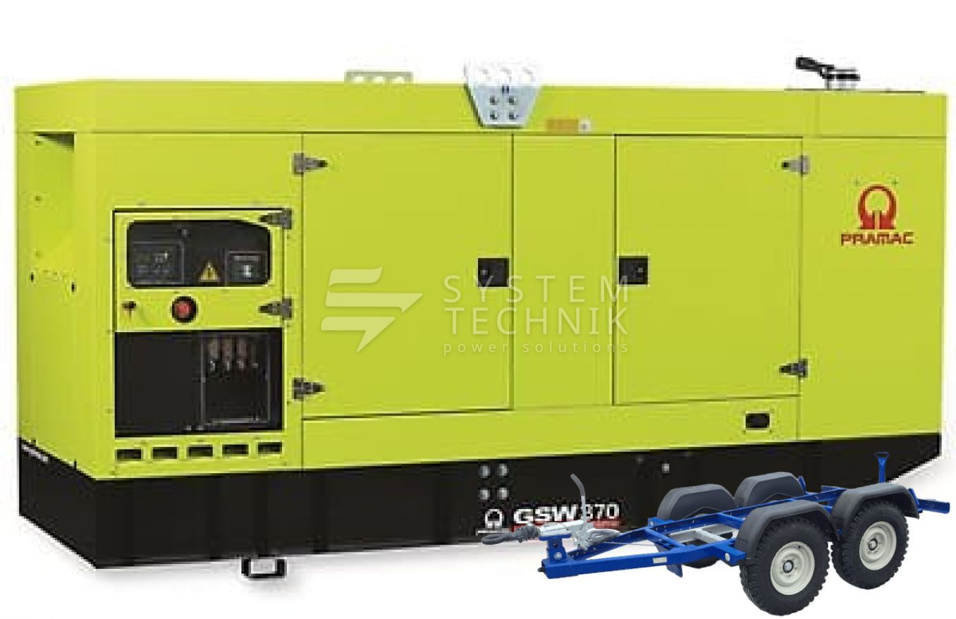 - Дизельный генератор Pramac GSW 370 V 230V 3Ф В кожухе на прицепе