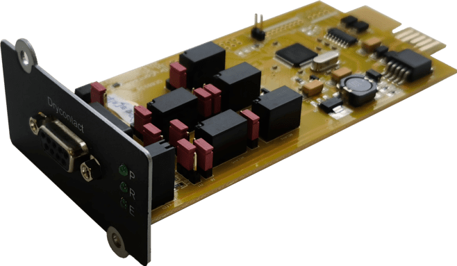 Карта сухих контактов позволяет удаленно отслеживать состояние ИБП путем получения дискретных сигналов при срабатывании реле. Контакты реле гальванически не связаны с электрическими цепями ИБП. Для получения необходимых сигналов необходимо использование внешнего источника питания. Так же обеспечивается возможность удаленного отключения ИБП с помощью подачи ссигнала на соответствующий порт. Использование релейных контактов позволяет интегрировать ИБП в системы локальной диспетчиризации на объектах заказчика.